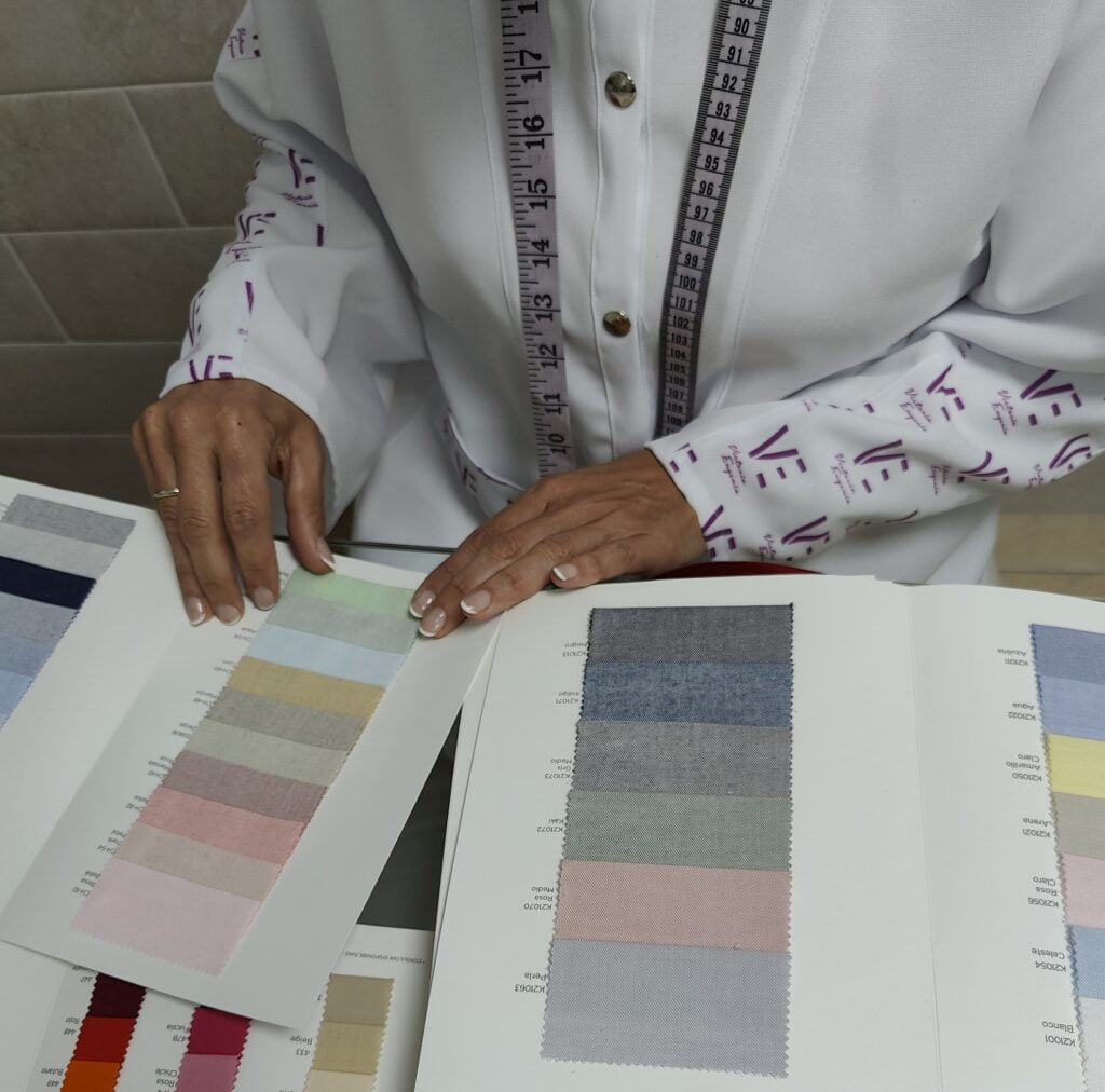 Una vez tenemos el diseño es el momento de elegir el tejido, el cual se elige con especial mimo, siempre de buena calidad y que aporte la elegancia que se busca en la prenda y la comodidad de quien la viste.