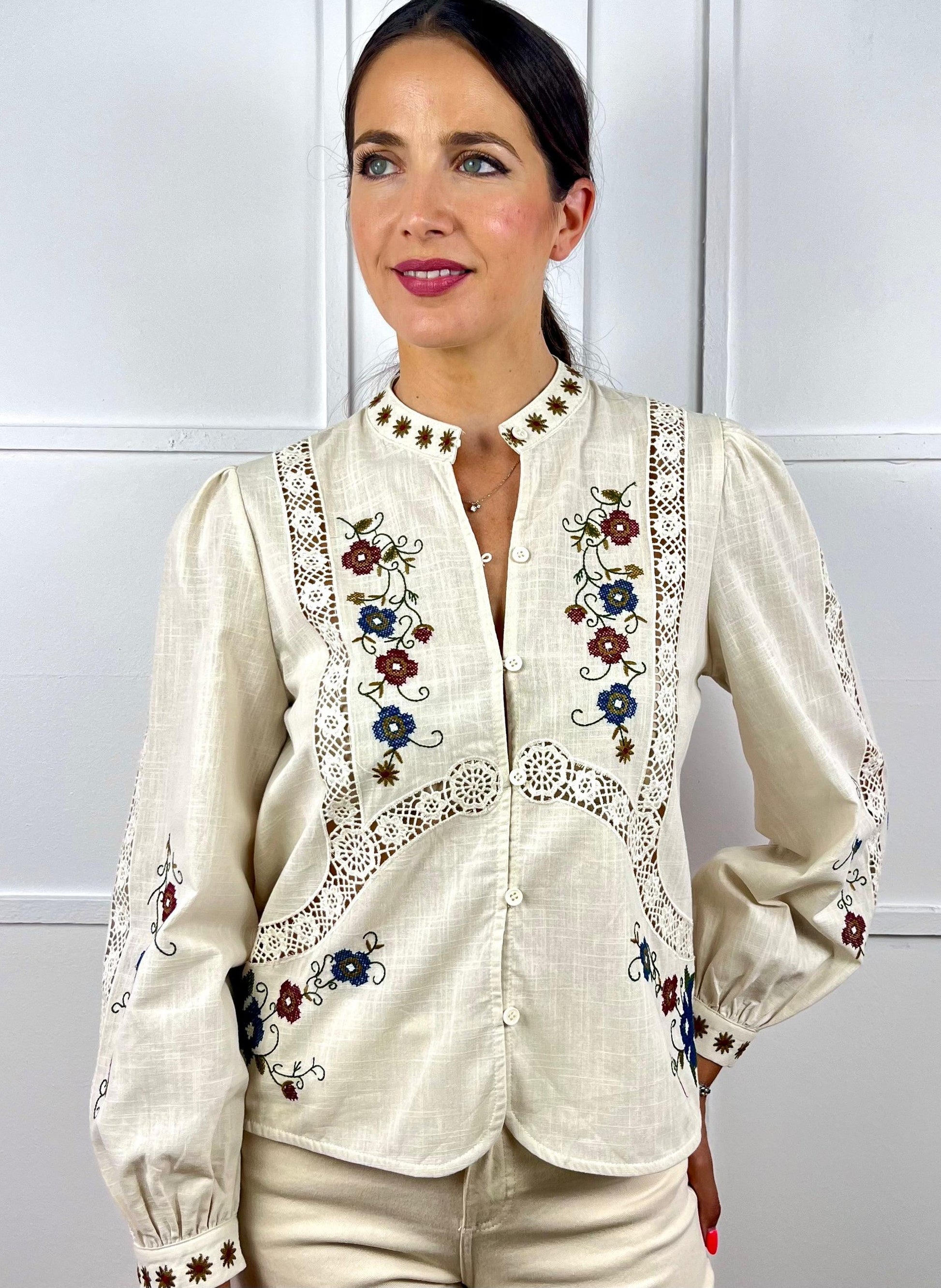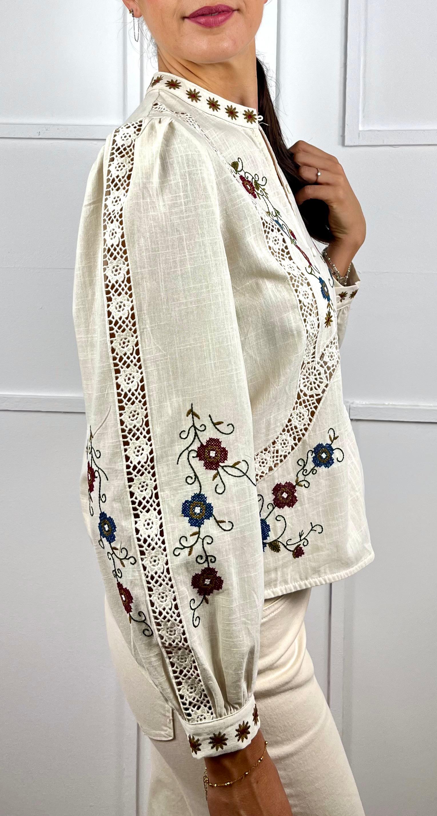 Nuestra CAMISA BORDADA BEIGE de manga larga en tono beige suave está confeccionada en un tejido de algodón. Su diseño destaca por delicados bordados decorativos que adornan la parte delantera, las mangas, el cuello y los puños, aportando un toque artesanal y distintivo. A lo largo de las dos secciones delanteras y en ambas mangas, se incorpora una línea troquelada que añade textura y detalle, rompiendo la uniformidad del tejido con un efecto visual elegante y sutilmente cómodo.