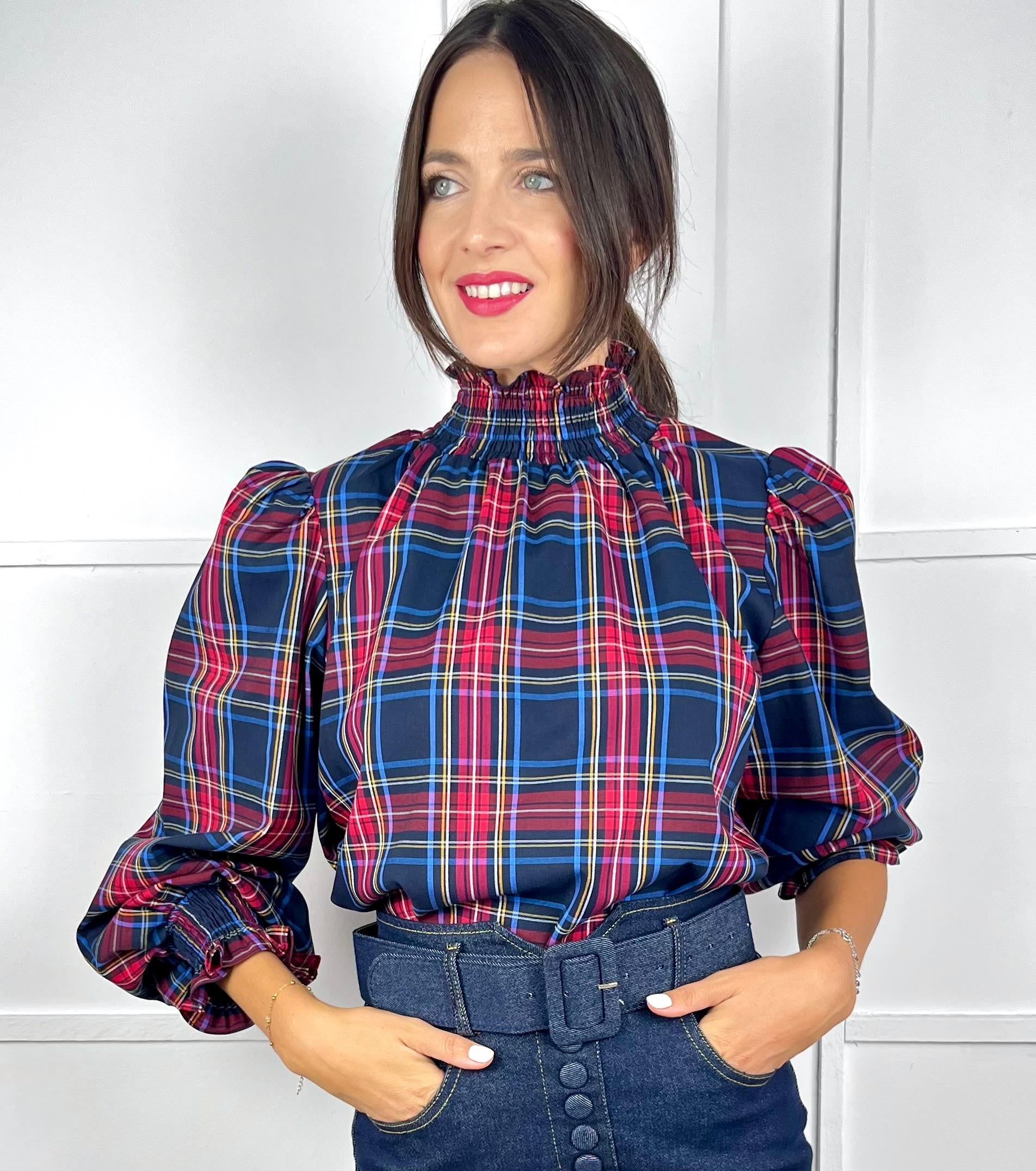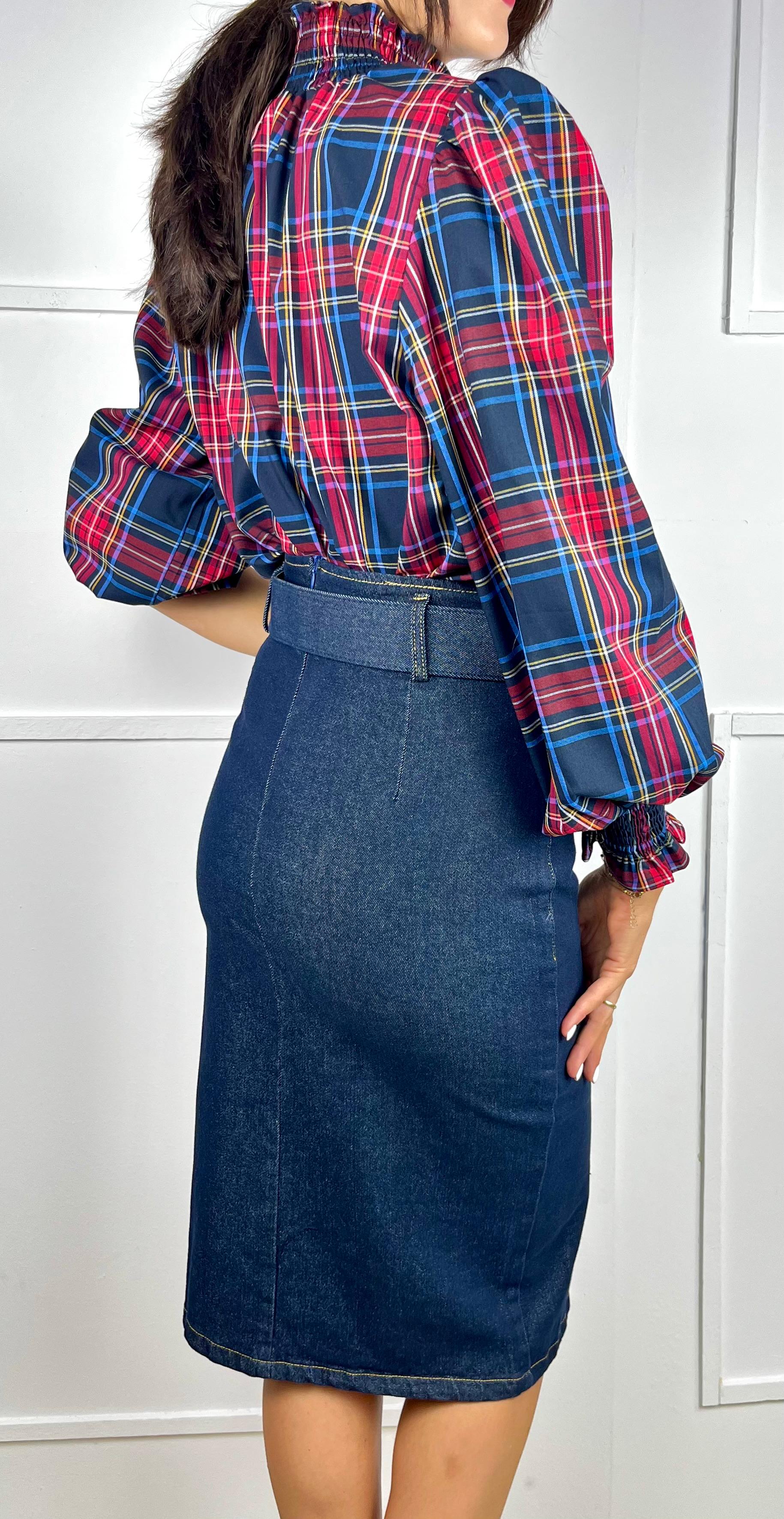 Nuestra CAMISA COUNTRY CHIC AZUL en un tejido de algodón de cuadros presenta una bonita combinación de colores en tonos rojos, azules y amarillos. El diseño presenta un cuello elástico alto y fruncido, lo que le da un toque elegante y voluminoso. Las mangas son abullonadas y se ajustan en los puños con la misma confección que el cuello, lo que añade un detalle llamativo y femenino. Es ideal para crear un look moderno, original y sofisticado.