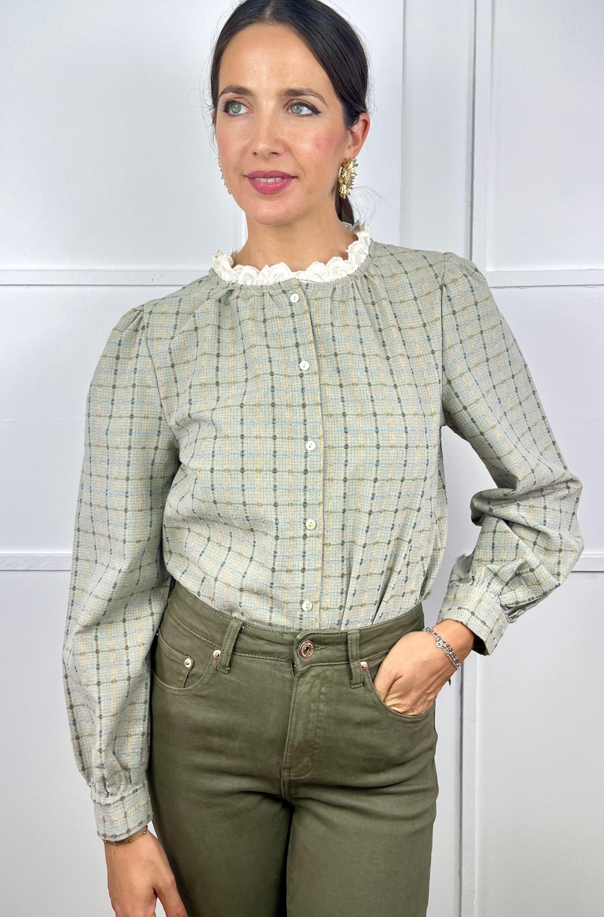Nuestra CAMISA OLIVA destaca por su delicado estampado de cuadros pequeños en tonos suaves, que le aportan un aire vintage y acogedor. Está confeccionada en una tela liviana con textura suave y sutil, perfecta para el día a día con un toque elegante.