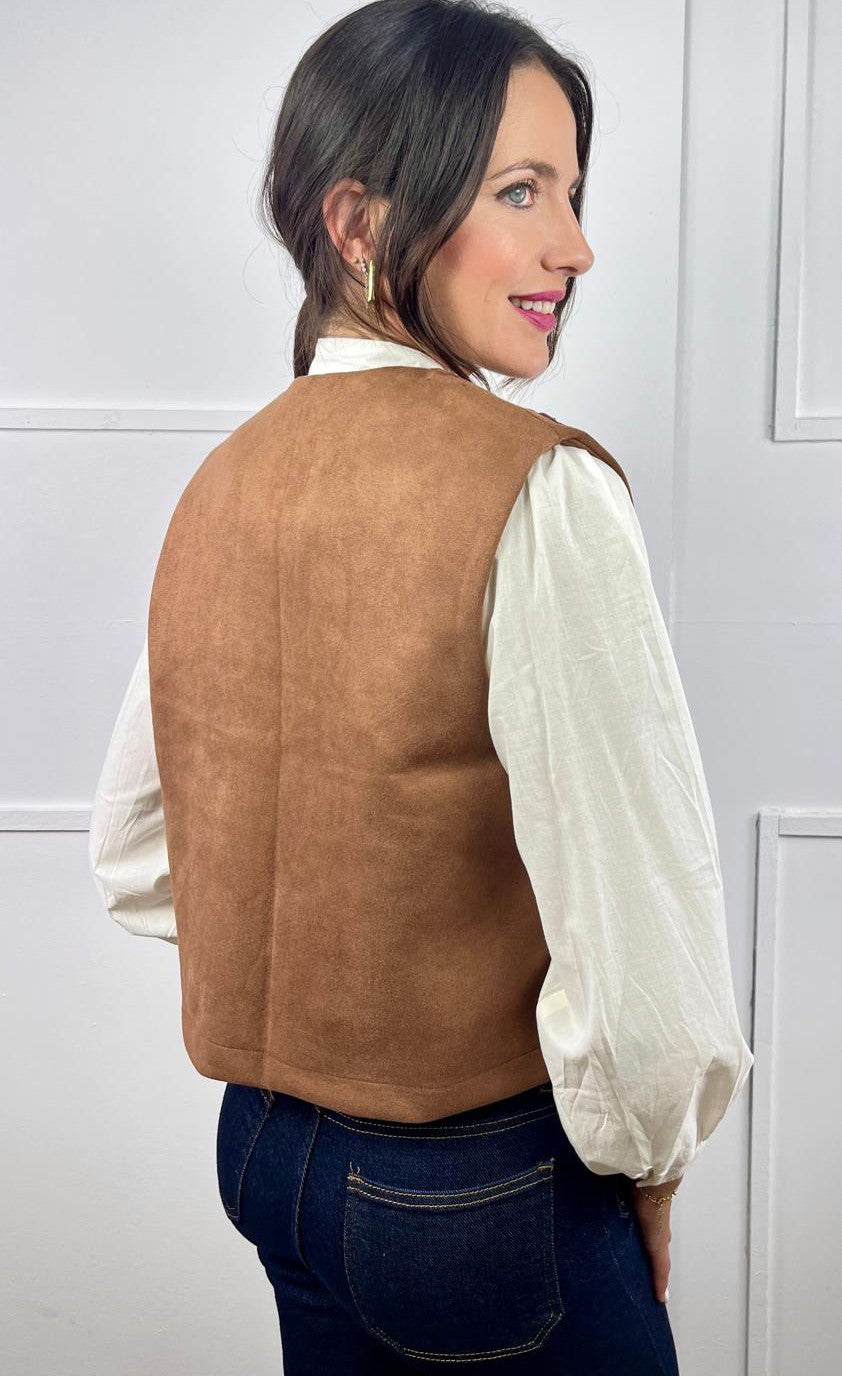 El chaleco, abierto, es muy versátil para superponer sobre blusas, camisetas, camisas o vestidos. Aportar un toque artístico y único a un outfit básico