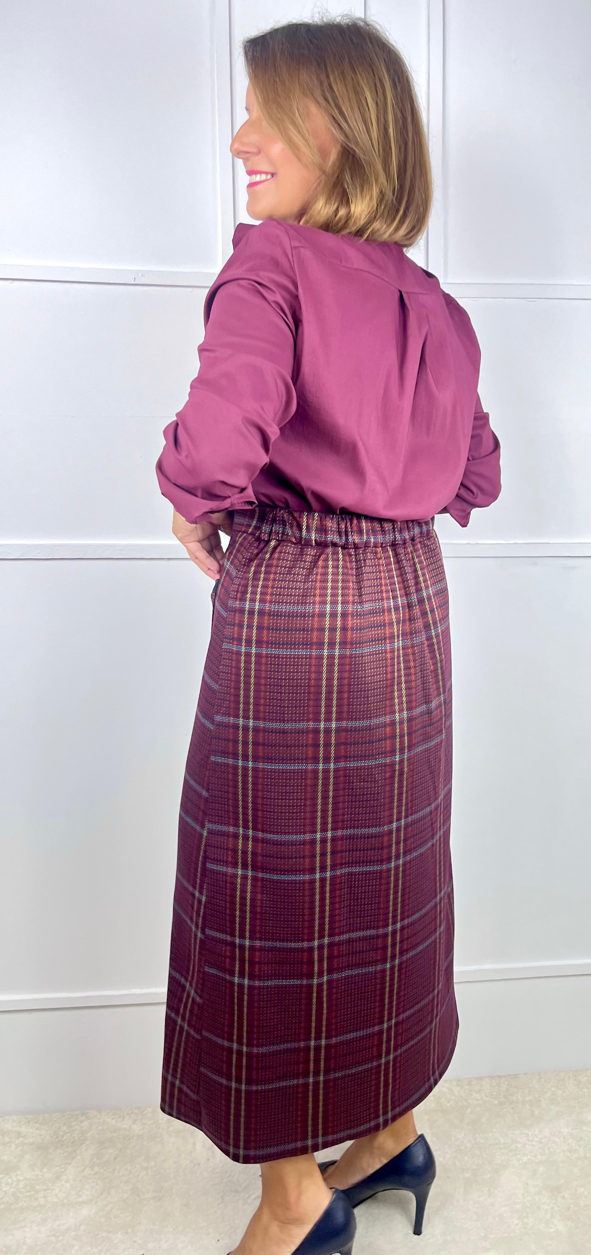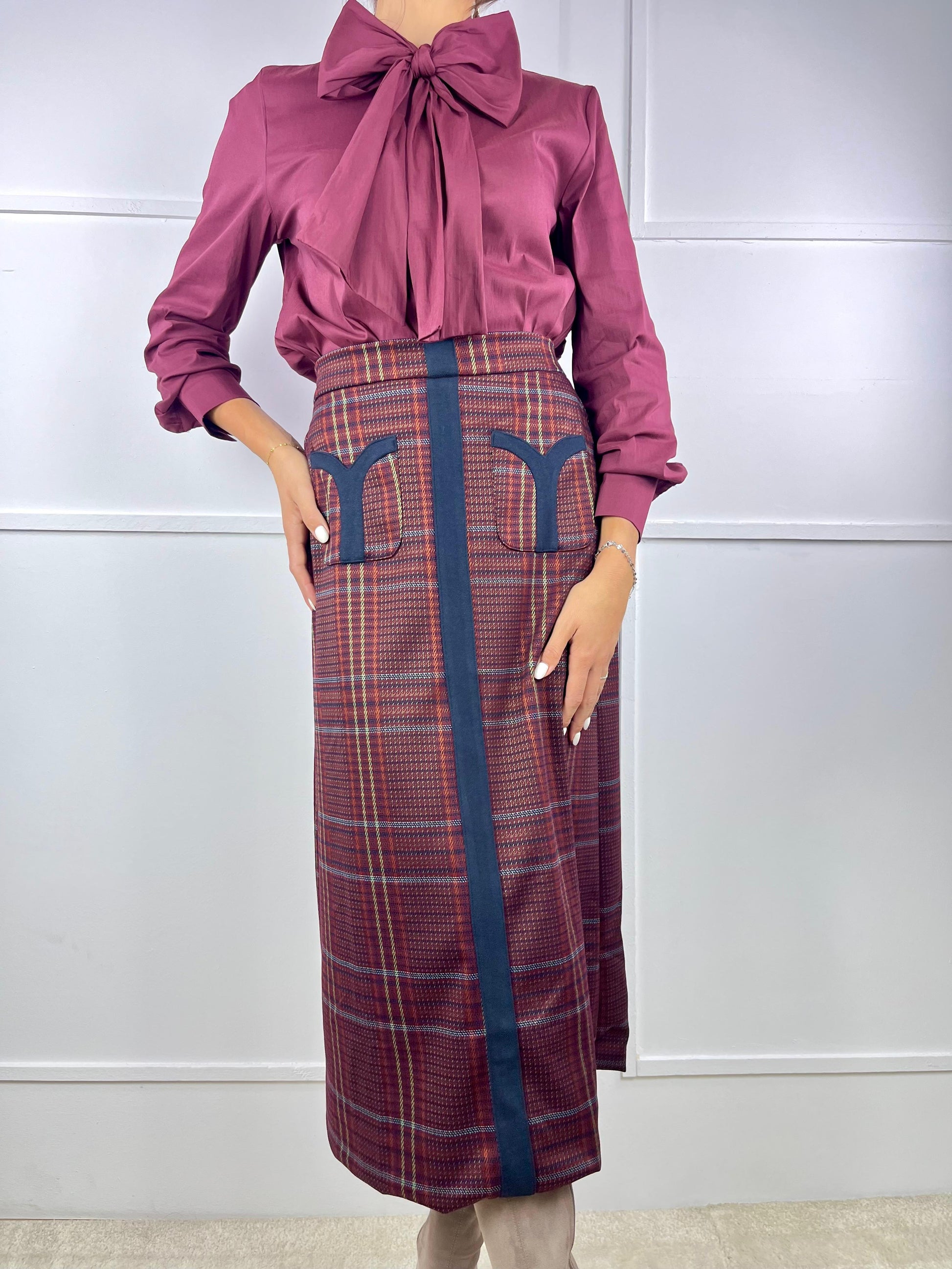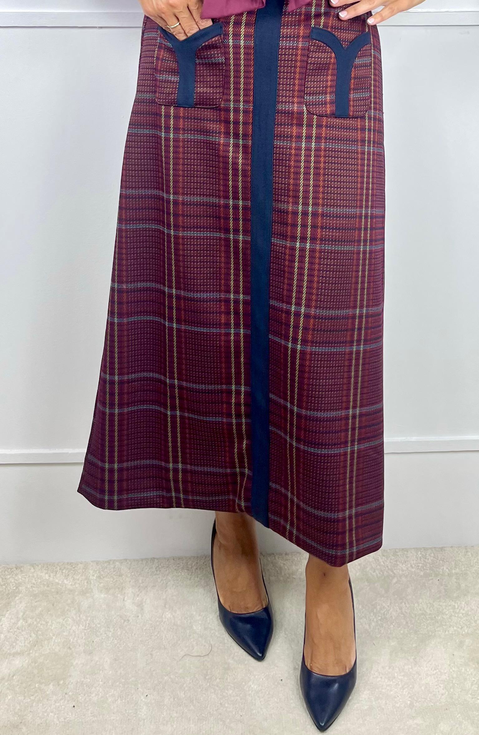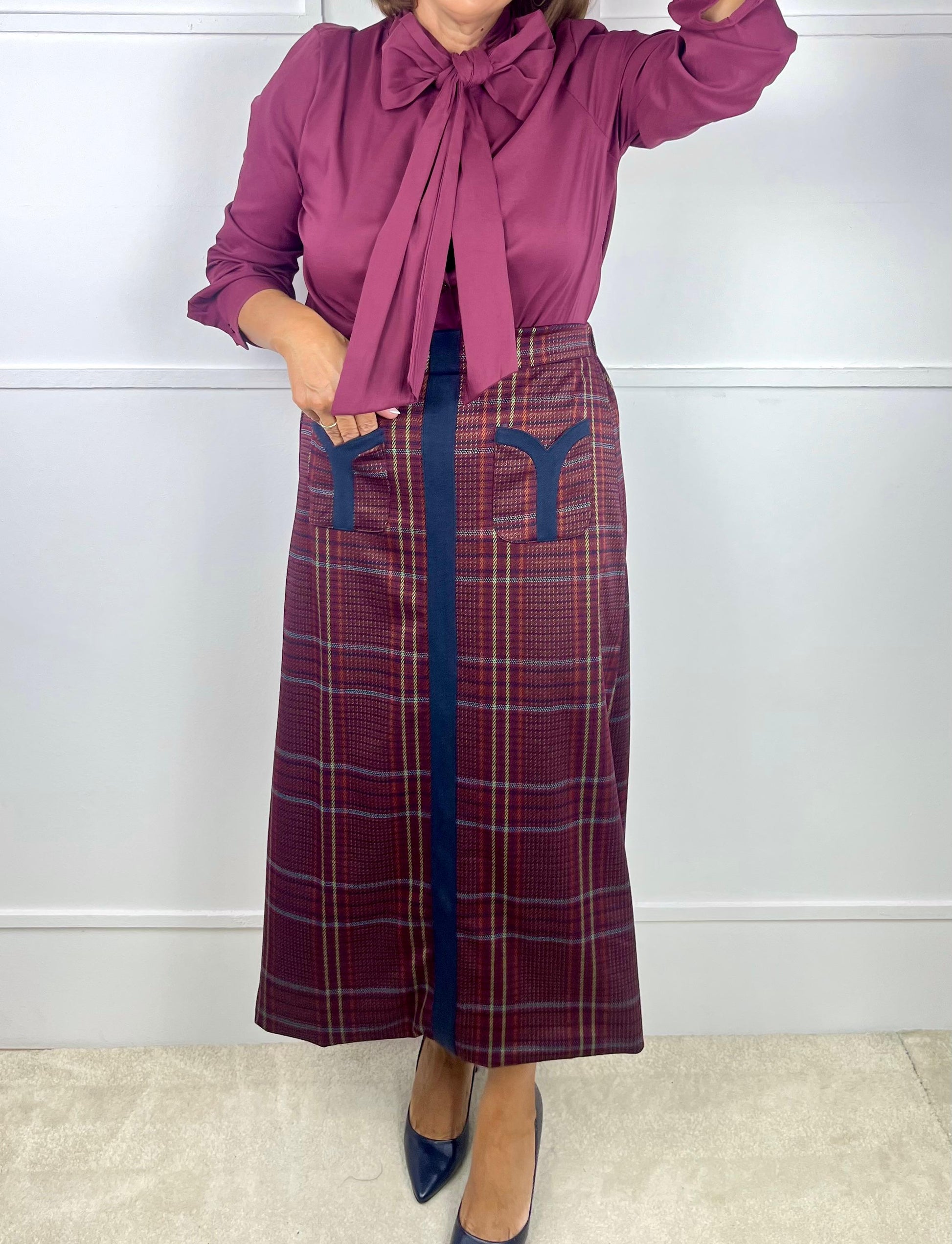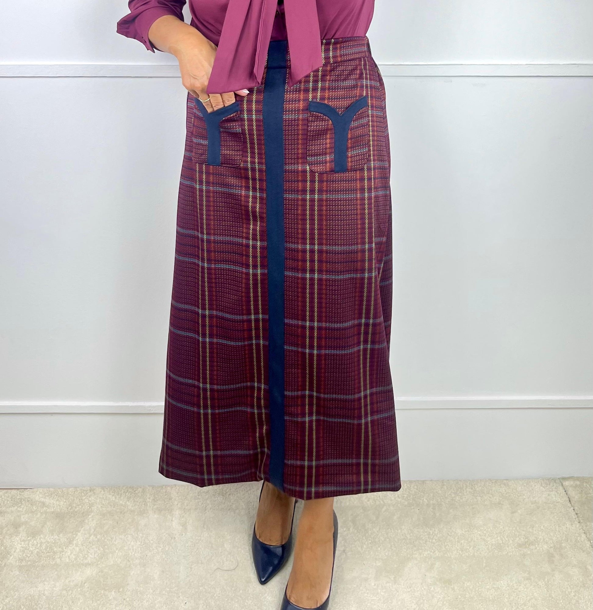 Nuestra FALDA VINO PARIS de estilo clásico y elegante, confeccionada en un tejido con estampado tartán en tonos vino, azul marino y mostaza, evoca un aire británico atemporal. Su corte recto aporta estructura y comodidad, ideal para estilizar la figura sin perder movilidad. Con forro interior y goma en la parte trasera de la cinturilla, le aporta gran comodidad.
