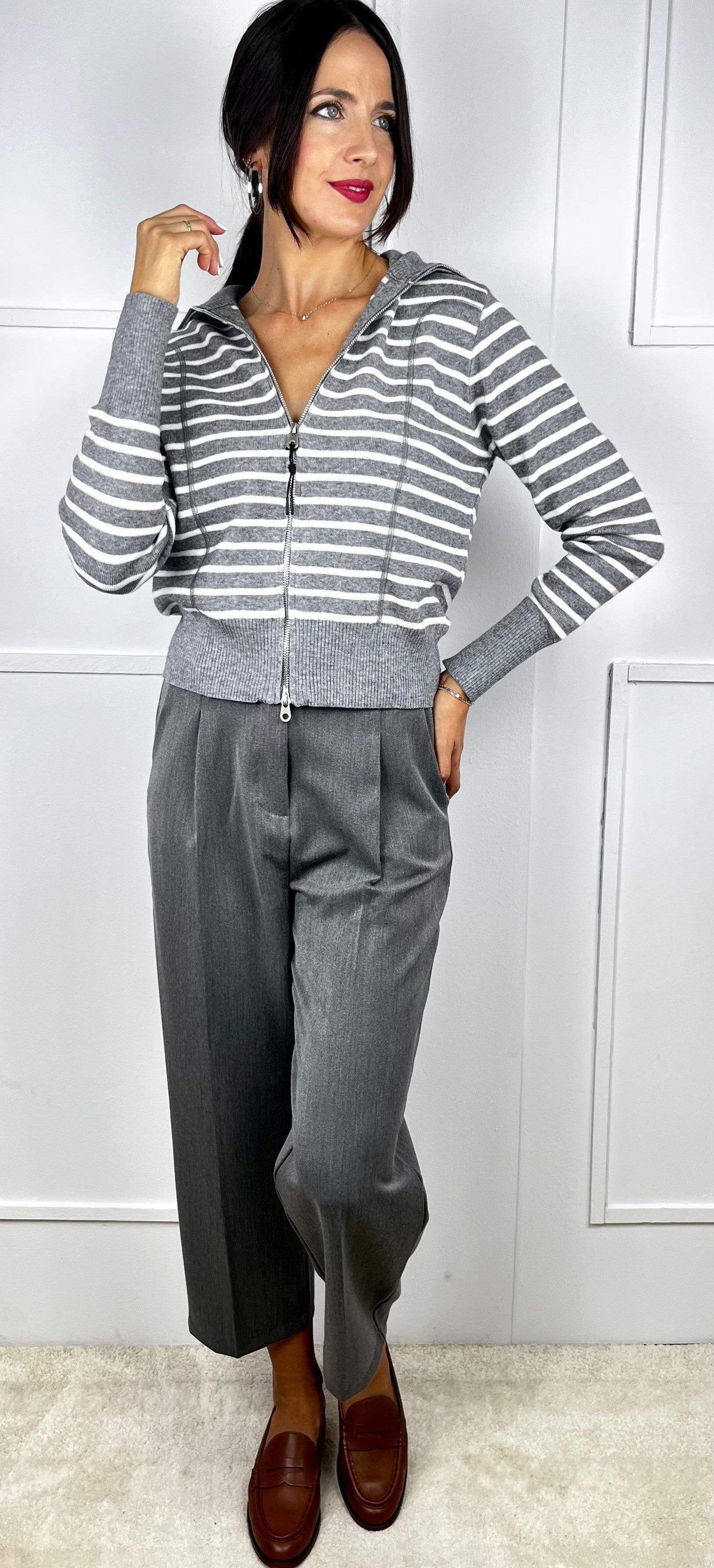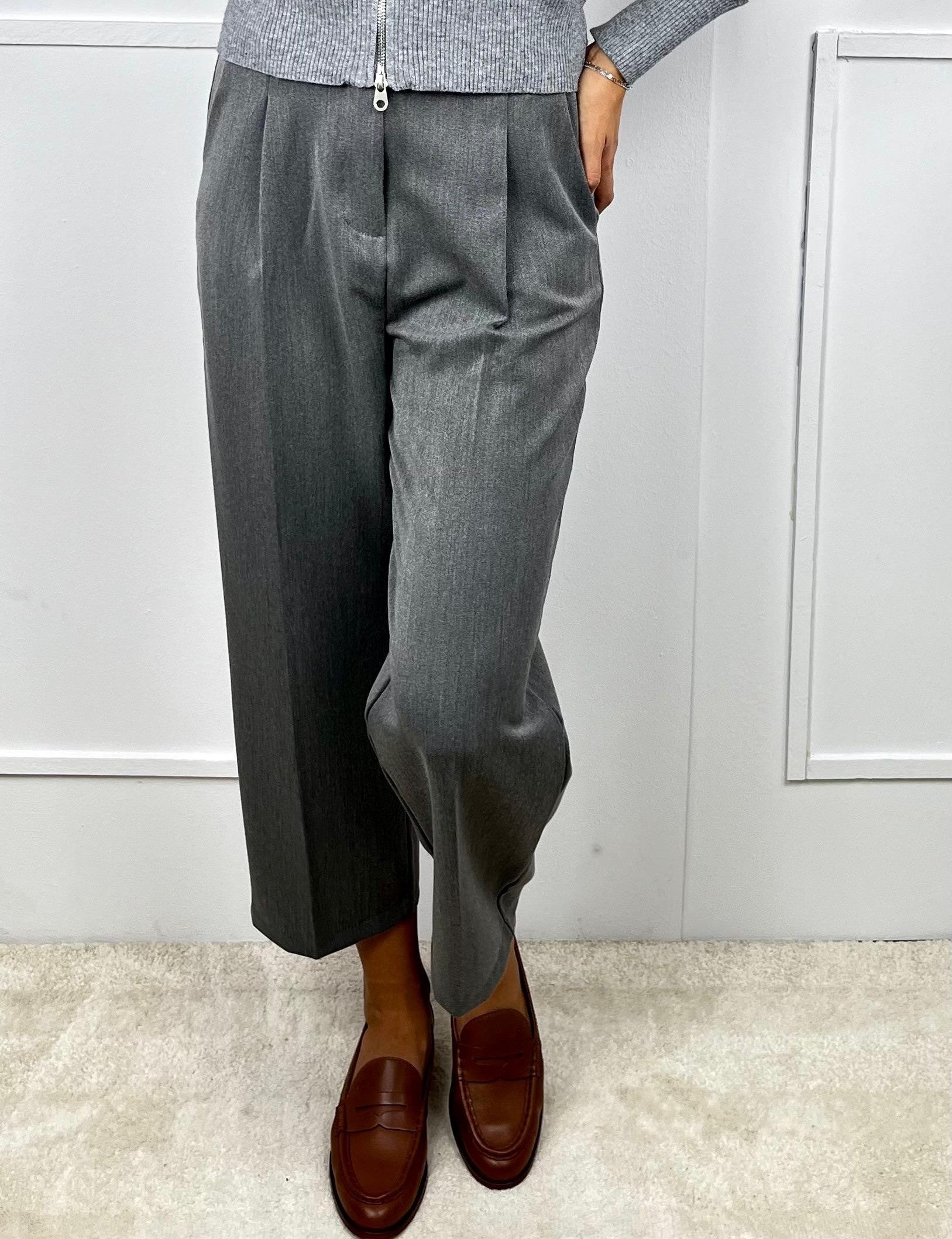 Nuestro PANTALÓN PINZAS GRIS tiene un estilo sofisticado. Presenta un corte recto y ligeramente amplio en la parte inferior, lo que da una sensación de fluidez al caminar. La pierna es de longitud media, ideal para combinar con distintos tipos de calzado. Con pinzas en la parte frontal, añade estructura y forma al pantalón, creando un look pulido y formal.